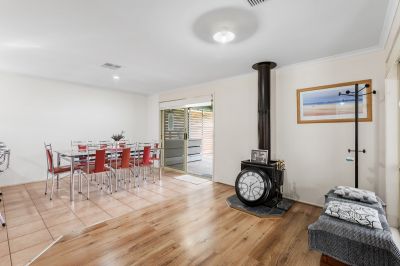 The dining area flows onto a decked, fully enclosed, undercover entertaining area, ideal for year-round gatherings. This outdoor space overlooks a well-maintained lawn, offering a perfect blend of indoor-outdoor living.