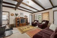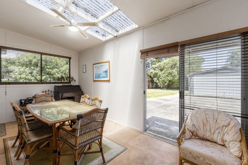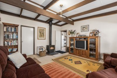 The existing home includes three bedrooms, a central bathroom, a cosy living area with a wood fire, and a sunroom that could be adapted as an extra living zone, study, or fourth bedroom. A double garage provides secure storage or workshop space.