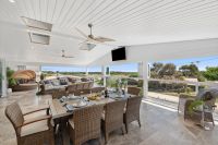At its heart, the expansive open-plan kitchen, dining, and living area delivers seamless flow and functionality. The gourmet kitchen includes a butler's pantry and premium appliances, while a gas log fireplace adds warmth and ambiance. The clever use of bifold doors open onto a spacious 7m x 12m enclosed alfresco, perfect for entertaining year-round, with Travertine stone floor tiles and fully built-in outdoor kitchen featuring Zeigler & Brown twin BBQ, extraction fans, and bar fridges fitted under Caesar work tops. Automated Velux windows bring in natural light and assist with climate control. From the kitchen and living room windows, enjoy watching the Spirit of Tasmania as it passes—a serene, ever-changing view.
