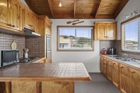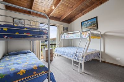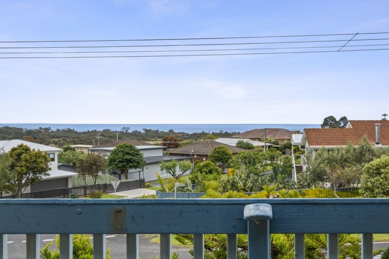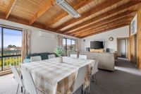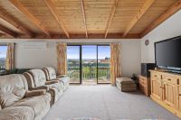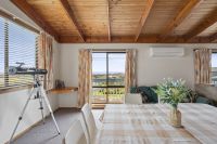 Inside, the home features multiple bedrooms across both levels, two bathrooms, an open-plan living and dining area, and a retro timber kitchen filled with natural light. High raked ceilings with exposed beams add warmth and character, while wide windows capture the treetops and coastline beyond.
