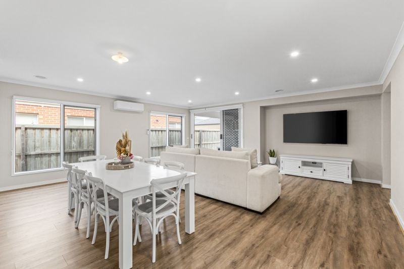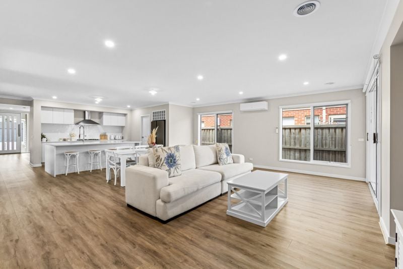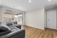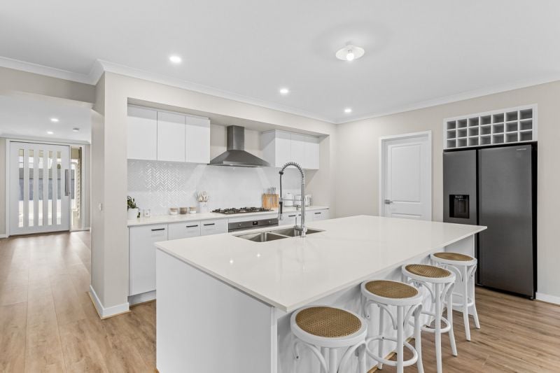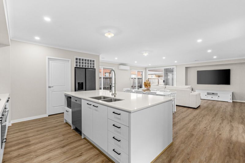 The stylish kitchen overlooks the spacious, light-filled open-plan living and dining area. Complete with a walk-in pantry, wine storage, plenty of additional storage, and premium appliances, it flows to an under-cover alfresco space—perfect for year-round outdoor entertaining.