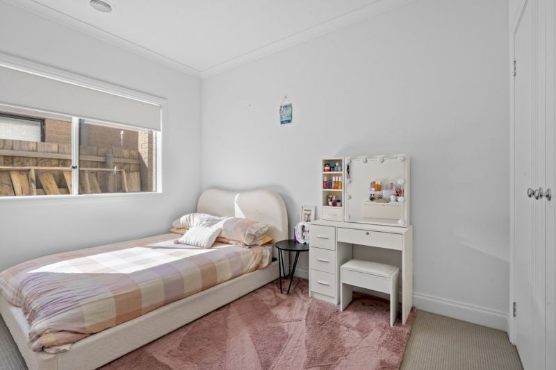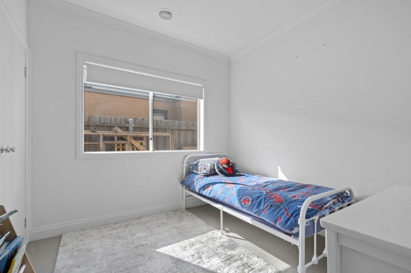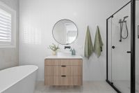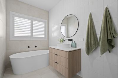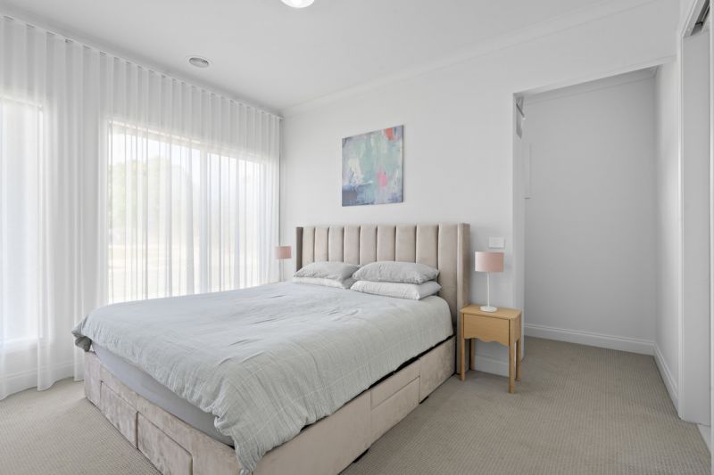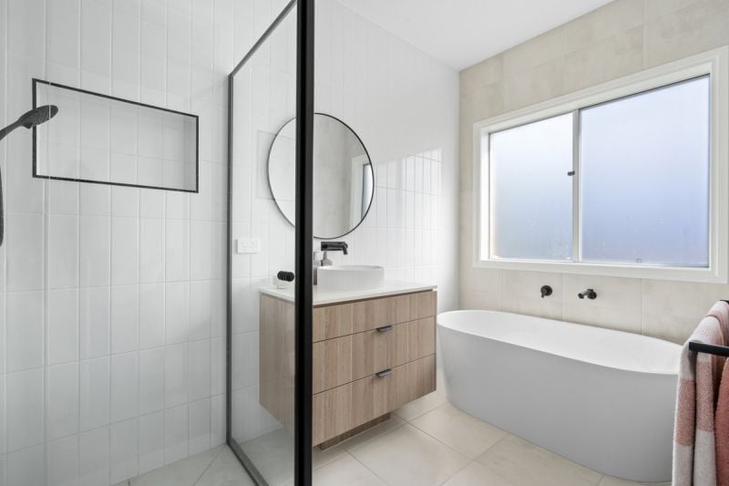 The master suite is a tranquil retreat, featuring a walk-in robe and a beautifully appointed ensuite with modern fixtures and a natural colour scheme. Three additional bedrooms, each with built-in robes, provide space for family or guests, serviced by a contemporary bathroom complete with a freestanding bath and sleek black fittings.