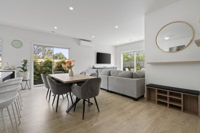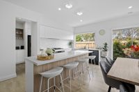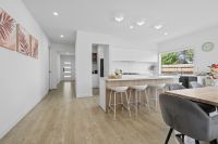 Behind its crisp white façade and modern lines, you'll find a warm, inviting home with timeless appeal. The spacious open-plan living and dining area forms the heart of the home, framed by large windows that draw in natural light and garden greenery. The neutral palette and soft timber floors create a calm, effortless elegance that complements the coastal surroundings.