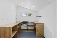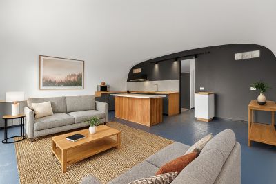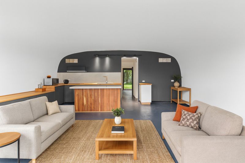 Step inside the main home and be impressed by the striking curved architectural design, soaring ceilings and open-plan living and dining area. The modern kitchen is both stylish and functional, featuring quality appliances, timber finishes and a spacious island bench ideal for entertaining.